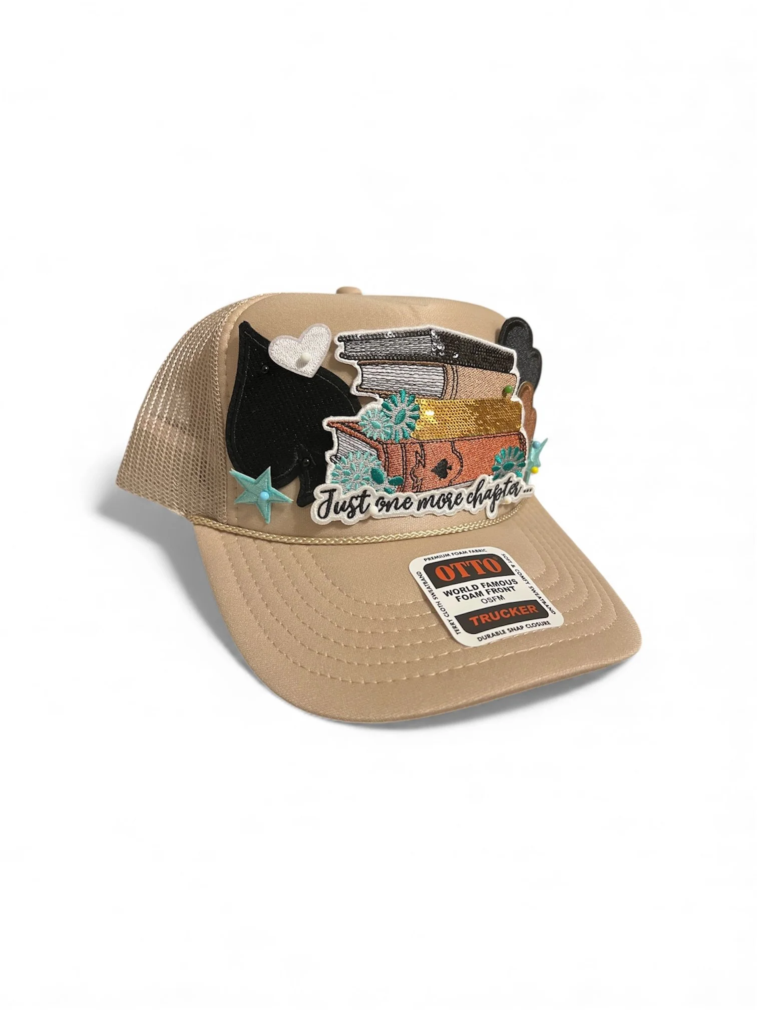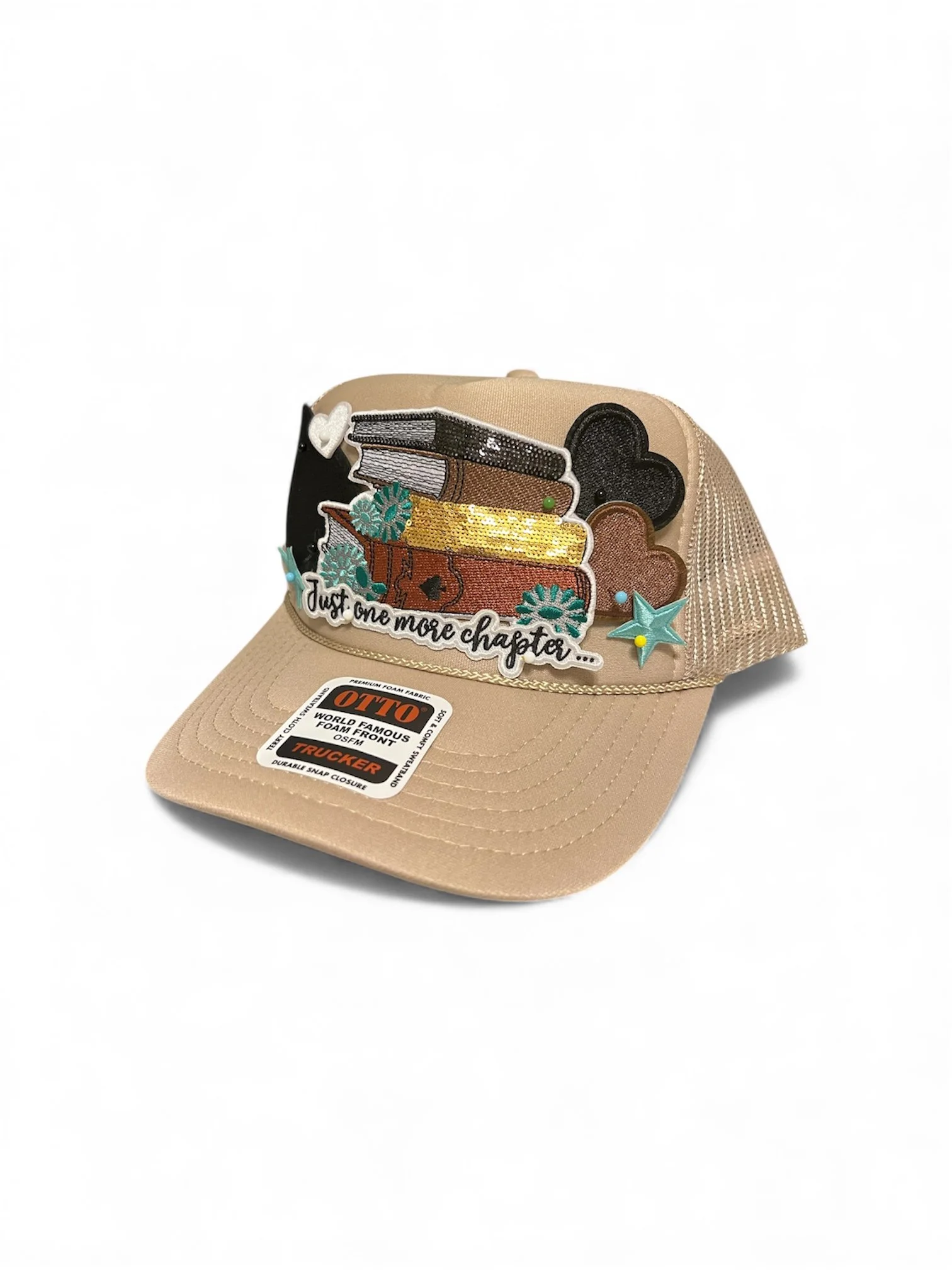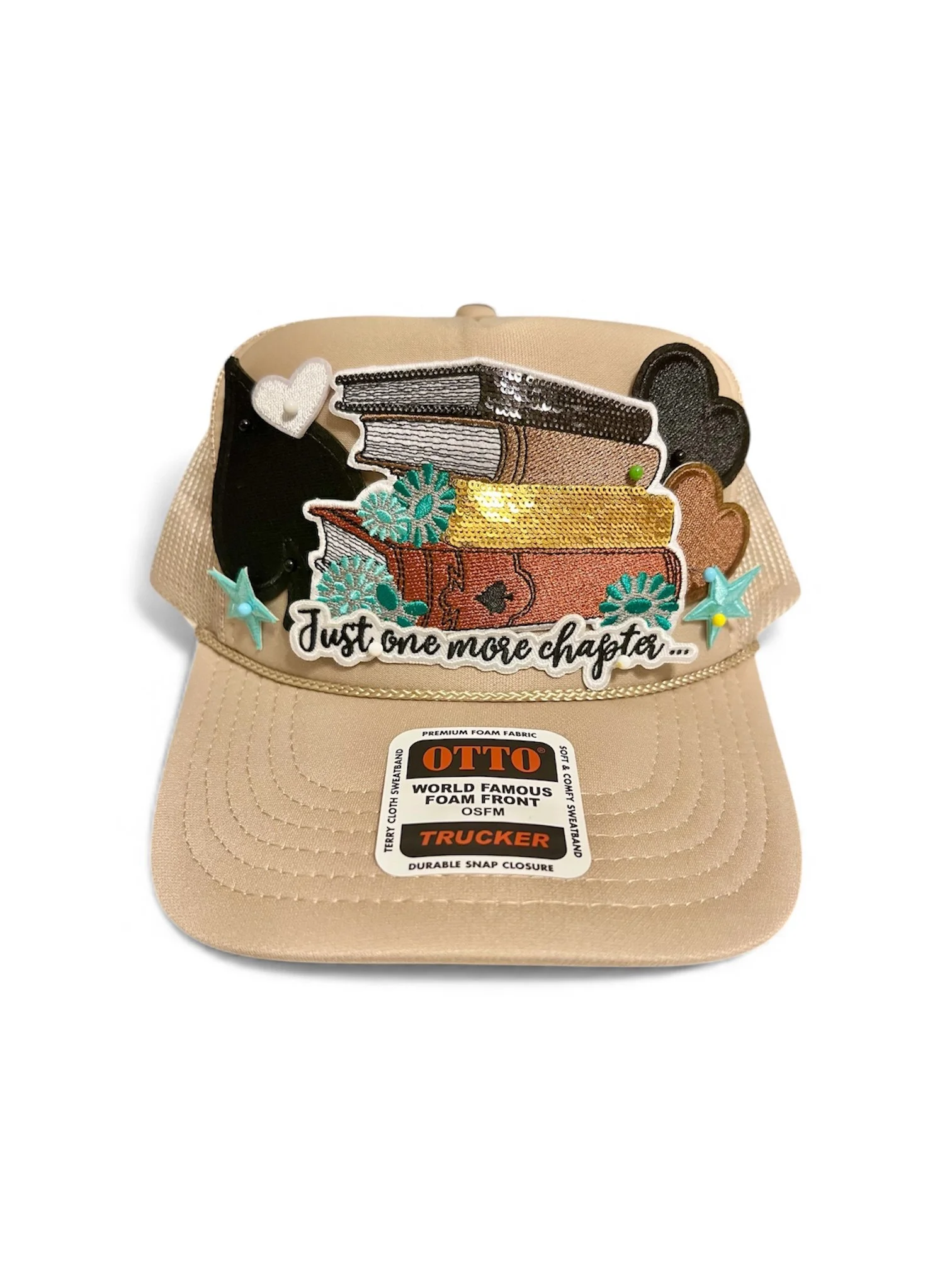 Image 1 of 3 Image 2 of 3 Image 3 of 3 Just One More Chapter Trucker Hat $38.00 This hat is pinned and prepped, will be pressed upon payment Purchase Added! This hat is pinned and prepped, will be pressed upon payment