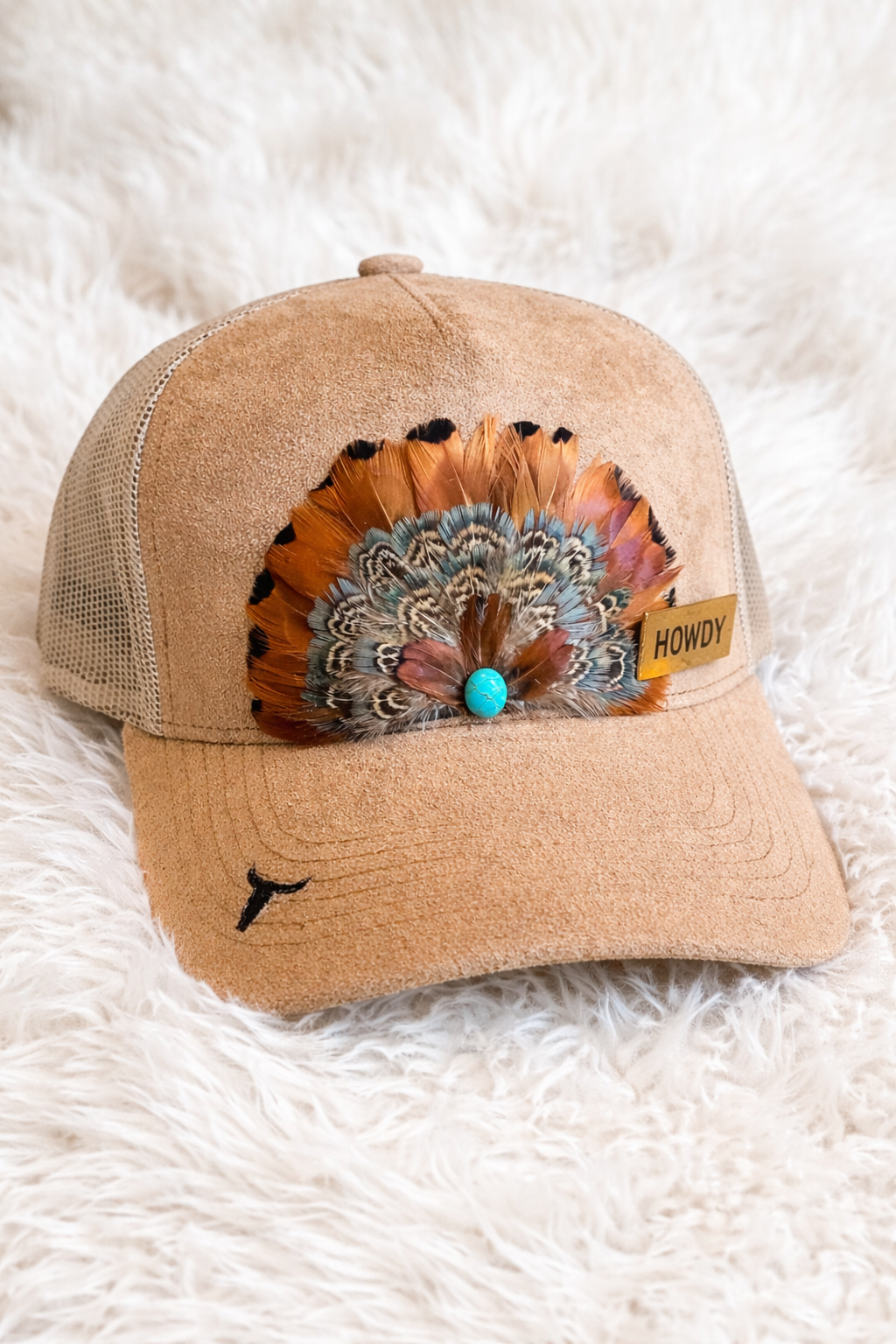 Custom suede trucker hat featuring a feather fan design, turquoise accent, and signature HOWDY tag. Adjustable snapback with a breathable mesh back for all-day comfort.