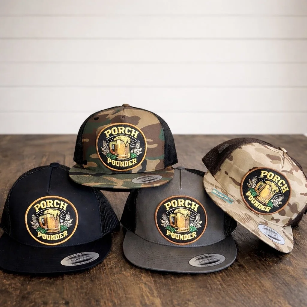 Image 1 of 1 Porch Pounder Flat Bill SnapBack from $35.00 Color: Select Color Black Gray/Black Green Camo Brown Camo Purchase Added!